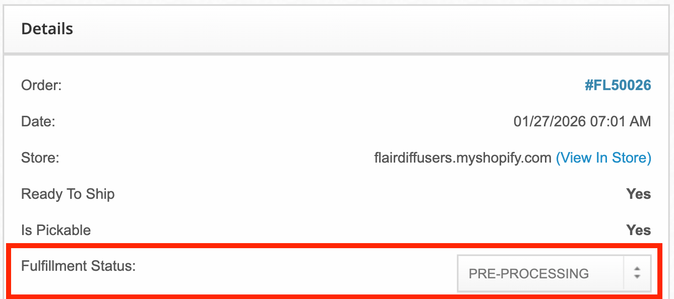 - Dans la section Details, changer le Fulfillment Status pour PRE-PROCESSING, puis cliquer sur Update Details au bas de la section Details.